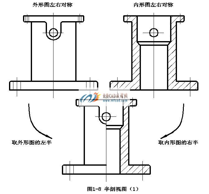 由于基建的结构左右对称,因此基建的主视图外形是左右对称的,主视图的全剖视图也是左右对称的。那么主视图就可以以对称中心线为界,一半画成剖视图,另一半画成视图,如图1-8所示。