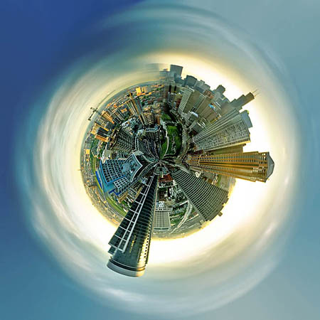本教程效果图非常有意思。一些漂亮的全景图经过简单的处理,变成了类似3D效果的球体。而且透视效果非常逼真。这么奇妙的效果竟然就是用极坐标滤镜来完成。大家可以尝试一下其它素材的效果。