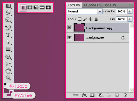1、新建文件1600 * 1200像素。 创建一个线性渐变 ,从左至右,与前景颜色设置为 #713c5c ,背景颜色为 #97316e。 然后复制背景层。