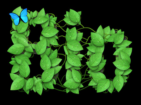 叶片字制作过程并不复杂,难点是创意思路的突破。文字中不能单单只有叶片,还需要有藤蔓,叶片上有水珠,同时还可以加入一些小花朵,小昆虫等来活跃画面。