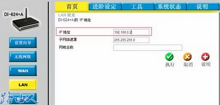 三、如果在这台友讯路由器的前端有另一台友讯路由器,并且也是D-Link品牌,请将此友讯路由器的LAN IP地址改成192.168.0.2或其他此网段的IP地址,以免与前端友讯路由器LAN IP冲突。