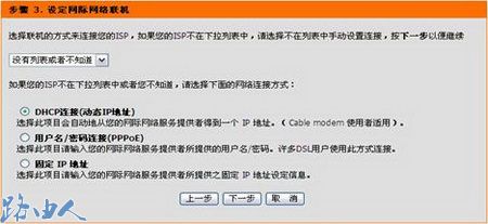 六、有三种方式选择:DHCP 连接(动态IP地址)、用户名/密码 连接(PPPoE方式)和固定IP地址连接方式,默认状态下为DHCP连接(动态IP地址)。