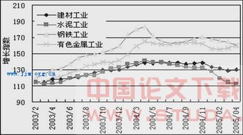 2005年一季度,受铁矿石和有色金属原料涨价等因素影响,多数钢铁品种、电解铝和主要的有色金属产品价格明显上涨。但受需求增速放慢影响,这些行业增长指数仍呈持续回落态势。固定资产投资,尤其是房地产投资增速明显放慢是主要原因。