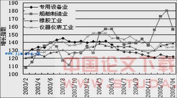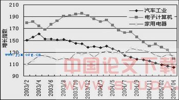 这些行业多数延续了2004年以来的持续回落态势。其中,汽车和电子计算机作为新一代家庭耐用消费品经历了过去几年的爆发式快速增长,从2004年开始出现需求增长“间歇”。到2005年2月,汽车工业增长景气较2004年12 月份下降了11点,是自2003年7月汽车工业快速增长以来的最大降幅,汽车累计产销也分别增长0.96%和—7%,创近年来新低。预计目前态势将延续到下半年,并有可能在今年年底前后出现回升。