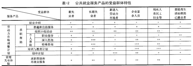 对公共就业服务产品性质的分析,初步明确了政府的职责。这些服务的强度随受益群体的不同而有很大差别,要想进一步明确公共就业各项服务的强度和界限,需要对受益群体的特性做详细分析。