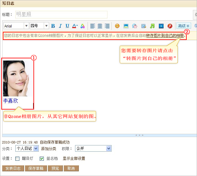 当您在QQ空间发表的日志含有带外网链接图片时(即:不是Qzone相册的图片),在日志编辑中会提示“您的日志中包含有非Qzone相册图片,为了保证日志可以正常显示,建议您转存图片到自己的相册。”若您查看到提示请根据以下方法操作: