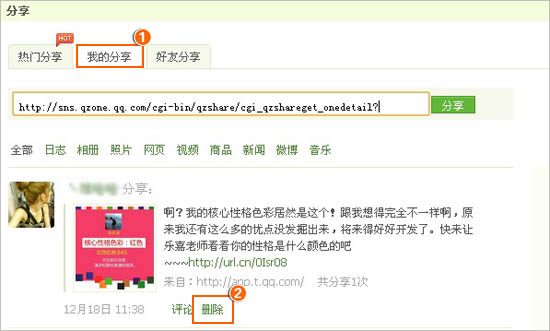 进入QQ空间,在导航上点击“分享”“我的分享”页面下找到您曾经分享过的内容,点击“删除”即可。